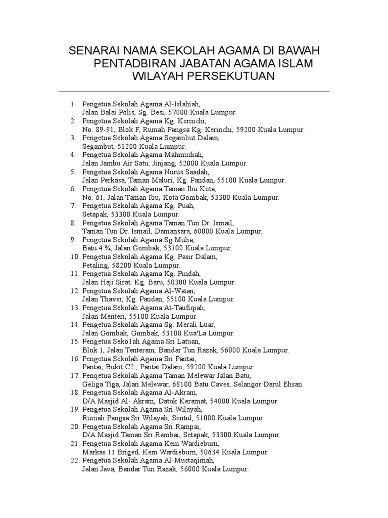 Senarai Nama Sekolah Agama Di Bawah Pentadbiran Jabatan Agama Islam Wilayah Persekutuan Pdf